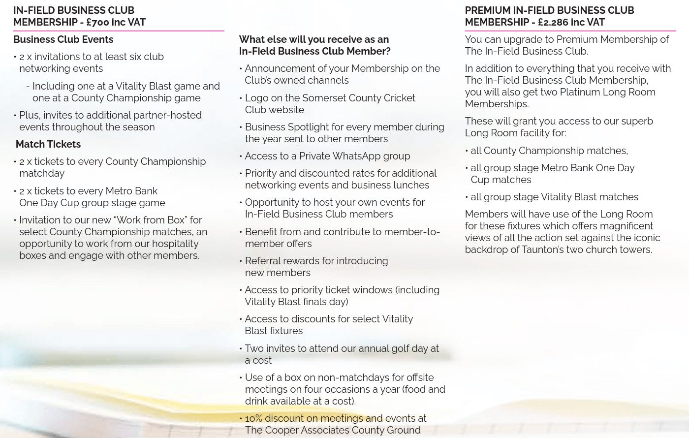 The In-Field Business Club brings together companies from across the region to connect, collaborate, network and succeed, while enjoying the very best of Somerset County Cricket Club.